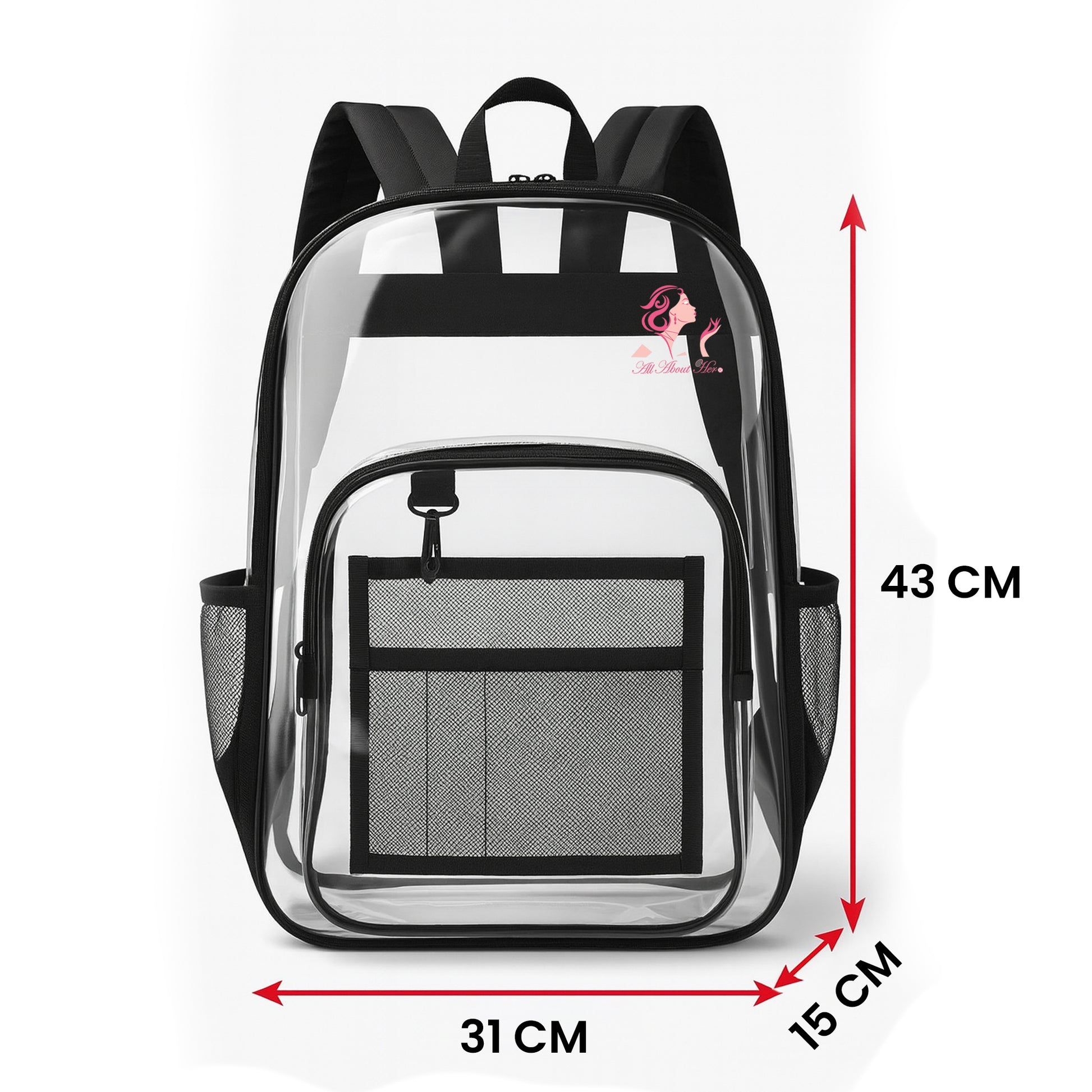 - See-Through Backpack: Quickly slip through airports, school gates, and stadiums with our clear backpack. In addition to its funky style, which is right on trend, our transparent bags offer ample space and organizational compartments to help you sort out your valuables.